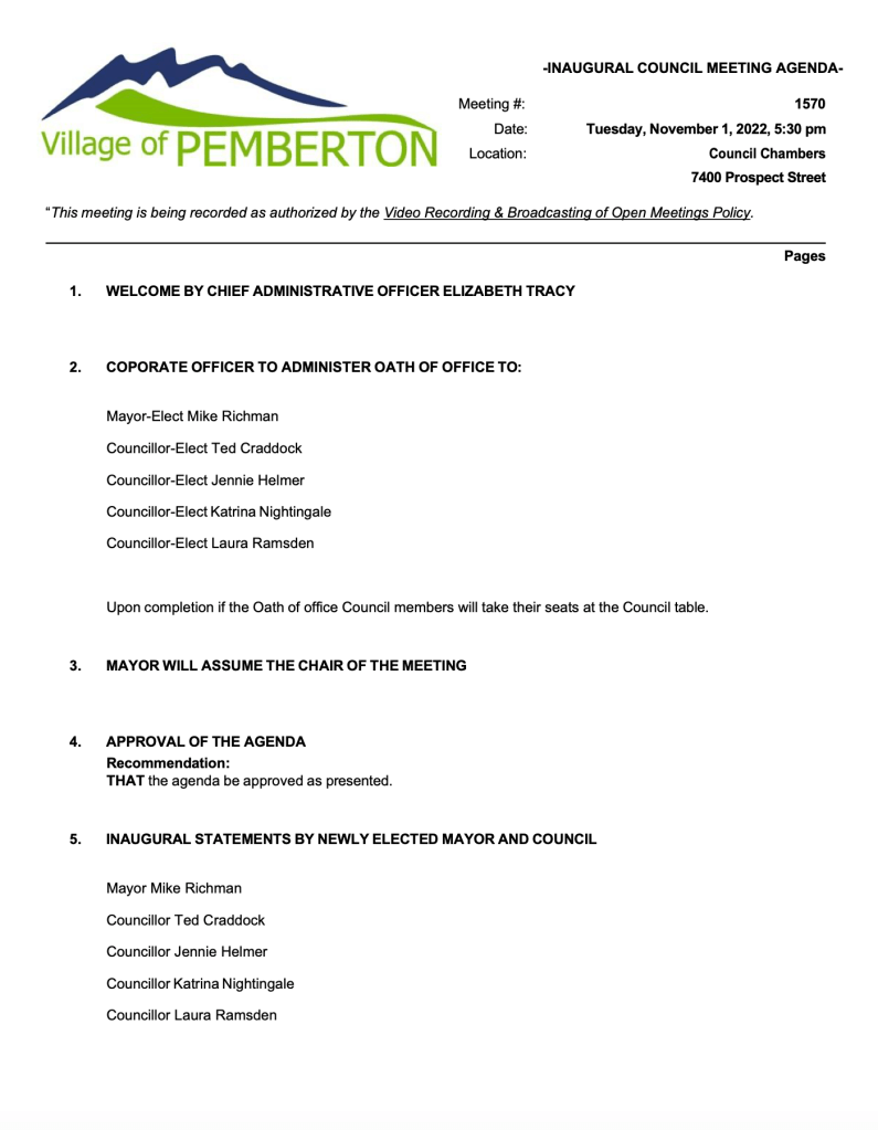 The Inaugural Council Meeting will take place tonight, Tuesday, November 1, 2022 at 5:30pm, and Mike Richman, Ted Craddock, Jennie Helmer, Katrina Nightingale, and Laura Ramsden will be sworn in.