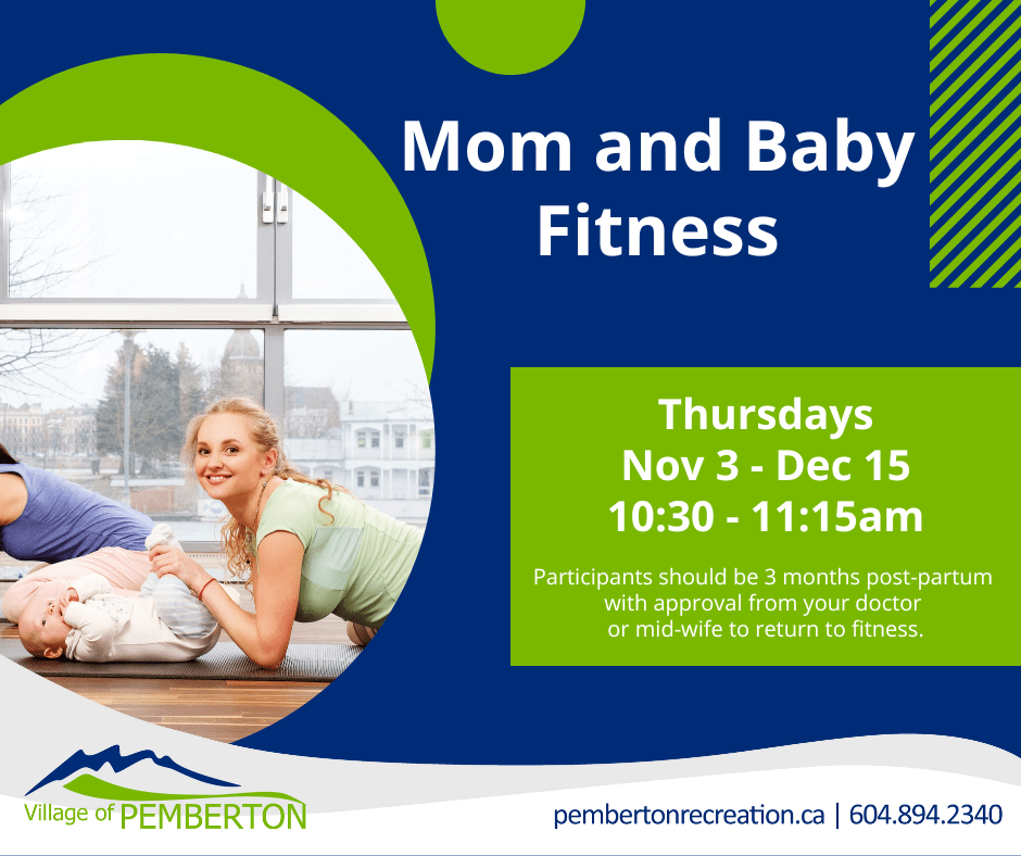 Bring your non crawling baby to mom and baby fitness class. Starting November 3rd at 10:30am, this 45-minute class will be a combination of strength training and low impact cardio to ease you back into your fitness routine. Sign up online at pembertonrecreation.ca