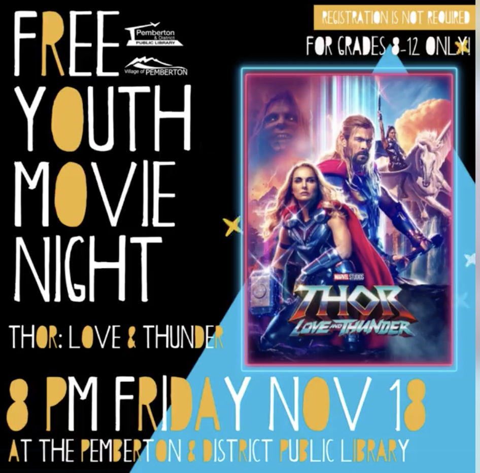 The Pemberton & District Public Library is partnering with the Rec and the Pemberton & District Community Centre, to screen Thor: Love & Thunder, on Friday, for free, with bonus popcorn! No registration is required. 8pm.