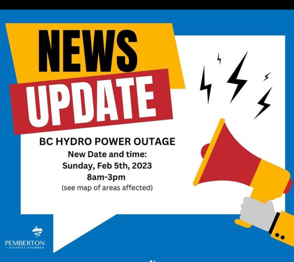 Thanks to the Pemberton and District Chamber of Commerce for negotiating with BC Hydro and providing updates about a scheduled power outage. It will now take place on Sunday, Feb 5, 8am – 3pm, and impact the addresses on the map below.