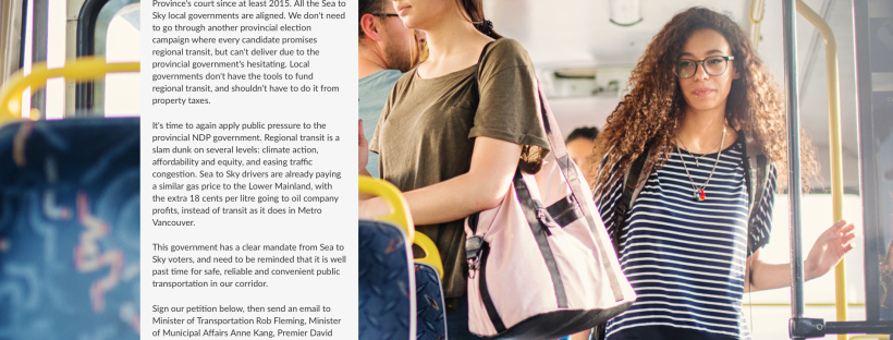 This government has a clear mandate from Sea to Sky voters, and need to be reminded that it is well past time for safe, reliable and convenient public transportation in our corridor.
