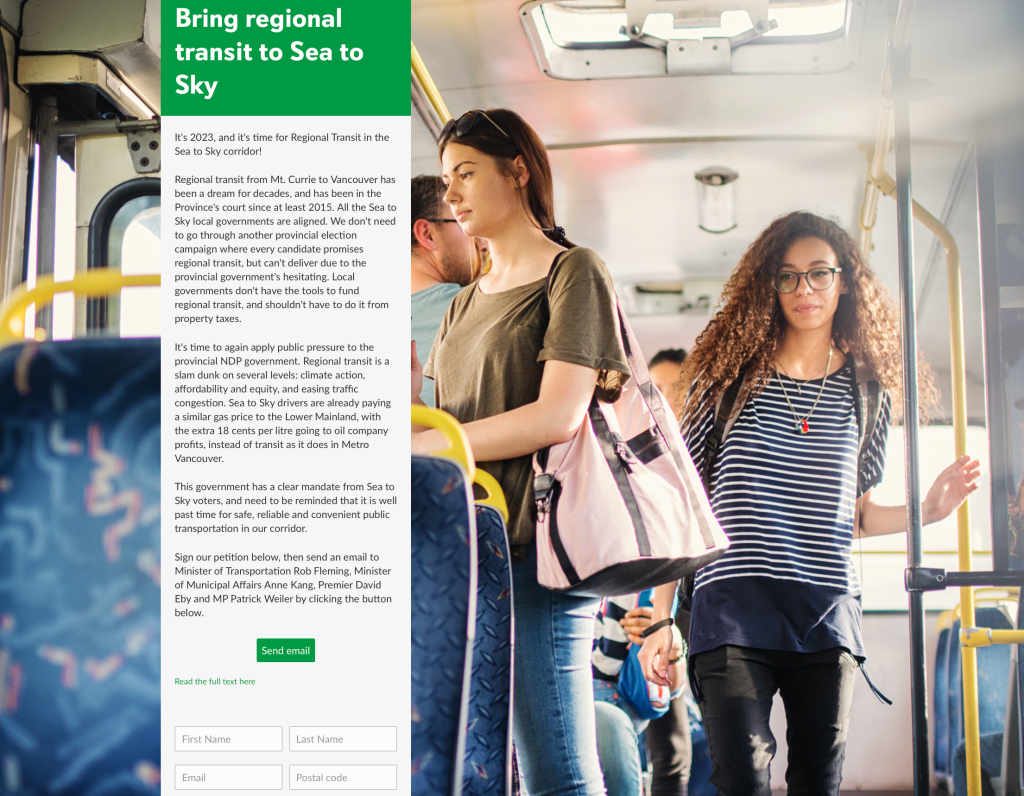 Sign our petition then send an email to Minister of Transportation Rob Fleming, Minister of Municipal Affairs Anne Kang, Premier David Eby and MP Patrick Weiler by clicking the button at https://www.bcgreens.ca/s2s_regional_transit