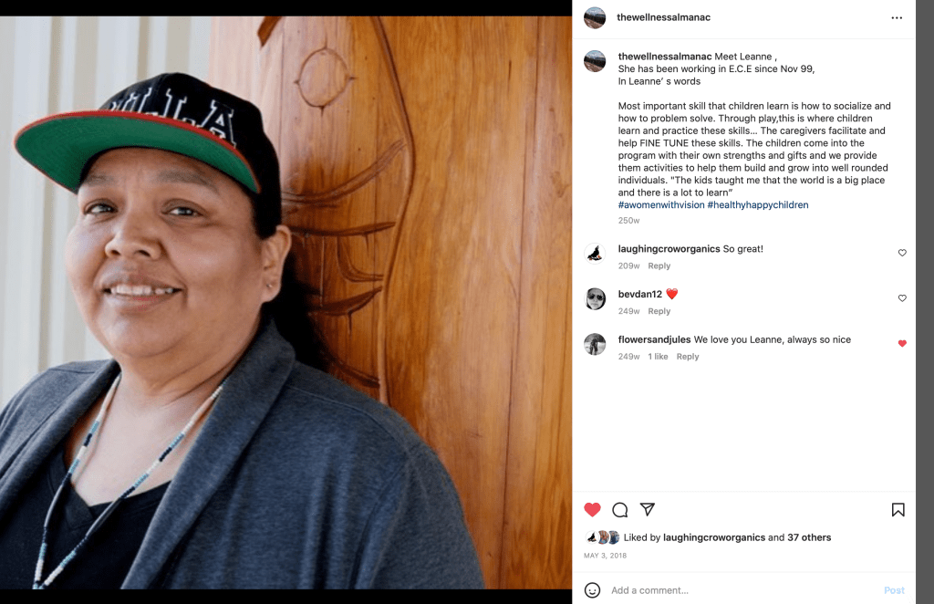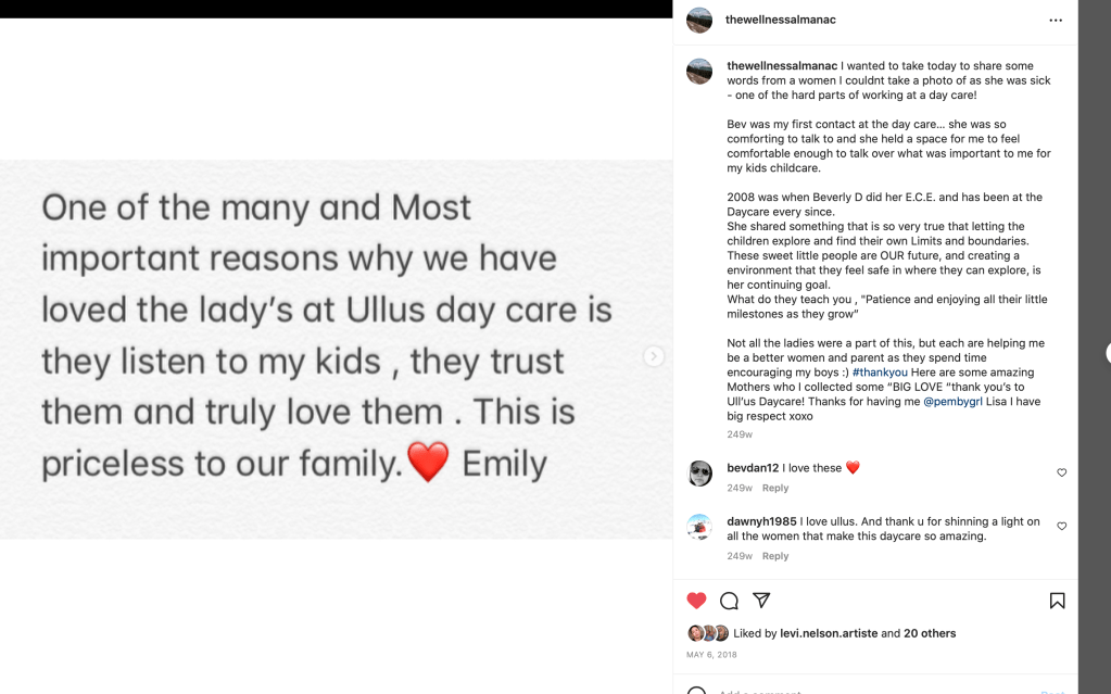 Following up on my post earlier this week, I wanted to resurface Brenda Bakker’s beautiful takeover for the Wellness Almanac from 2018. She offered to do an instagram takeover for us, wanting to use that opportunity to honour the beautiful carers who were supporting her life, and her babies, at Ullus daycare. https://www.instagram.com/p/BiM8DWnFkJK/?taken-by=thewellnessalmanac