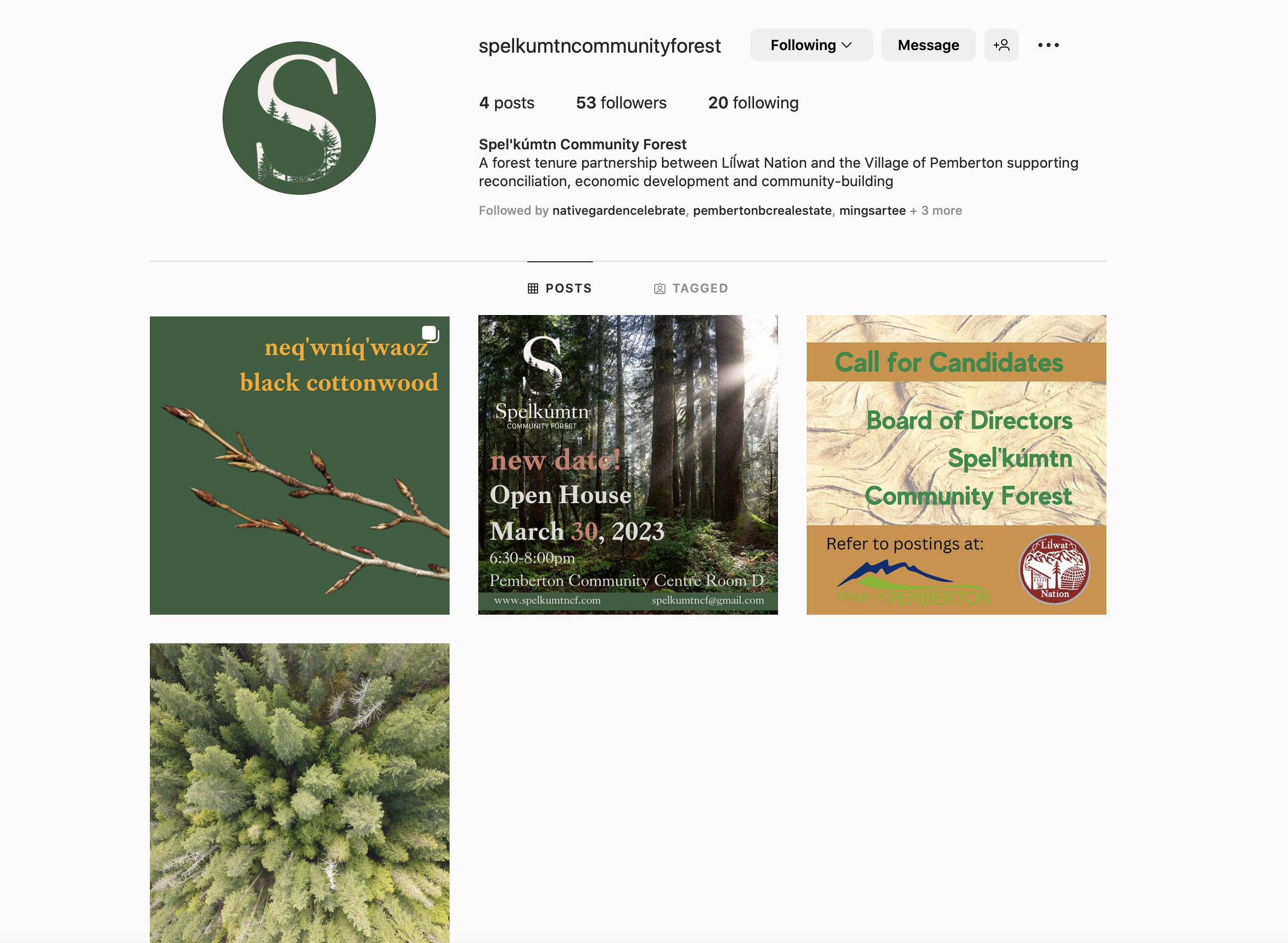 The Spel’kúmtn Community Forest, a forest tenure partnership between Líĺwat Nation and the Village of Pemberton supporting reconciliation, economic development and community-building, is now on instagram, at