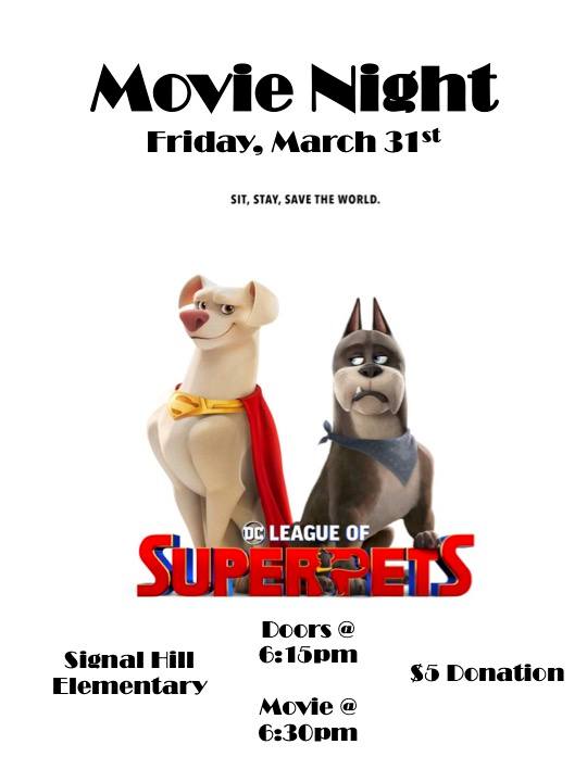 Hooray for the Signal Hill PAC, who have revived a pre-pandemic fundraising tradition, of hosting movie night in the gym. We got to watch the Pemberton premiere of Blank Collective’s Feel Real in November, (and meet Stan Rey and Anna Segal!), and this Friday, you are invited to watch The League of Superpets.