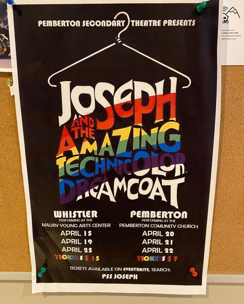 Pemberton Secondary School presents Joseph and the Amazing Technicolor Dreamcoat: a sung-through musical with lyrics by Tim Rice and music by Andrew Lloyd Webber, based on the character of Joseph from the Bible’s Book of Genesis. Get your tickets to see the show in Pemberton (at the Community Church up the hill) at https://www.eventbrite.ca/e/pemberton-location-pss-joseph-and-the-amazing-technicolor-dreamcoat-tickets-560816375877?fbclid=IwAR2df10etGt9IdKhyHqXyvGWwciQDjWZCXqQaChvx7_jgFBgpDTKTTkmppQ