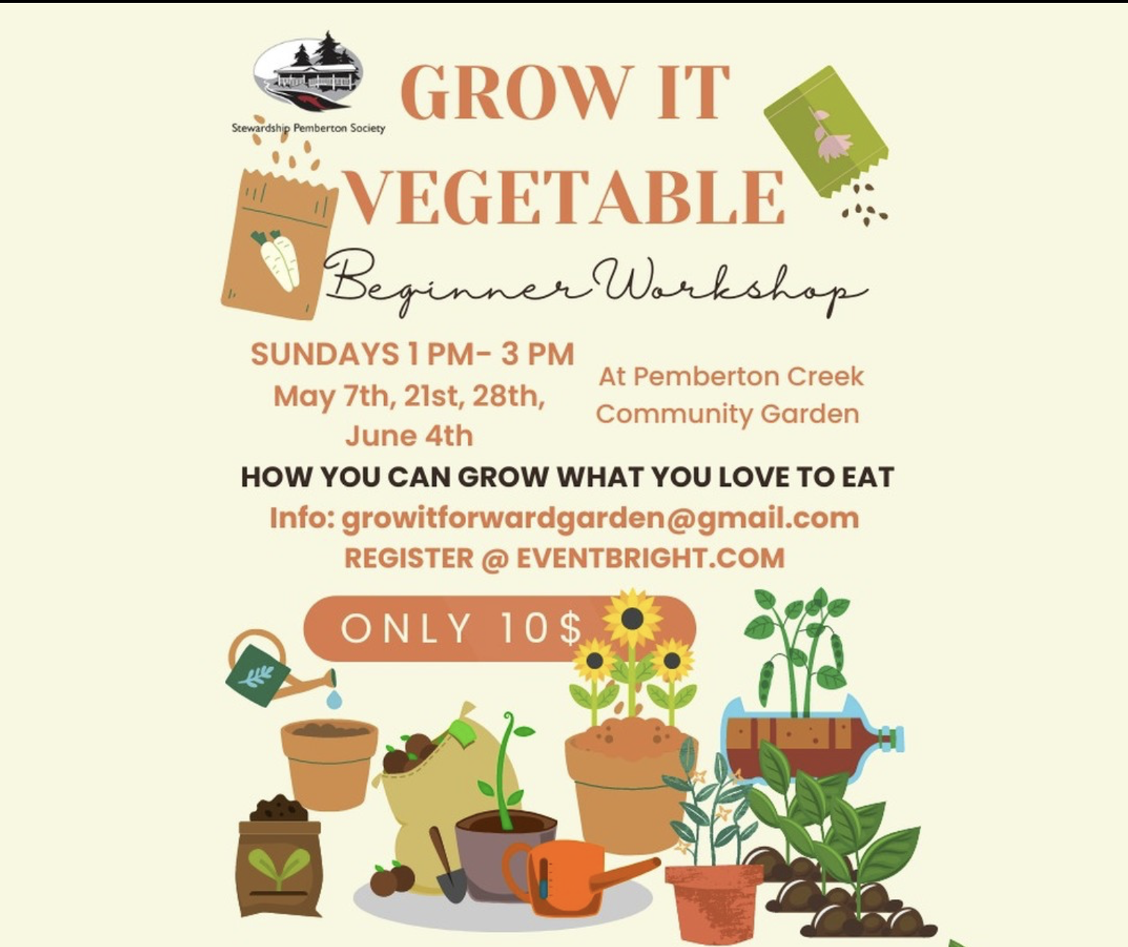 Learn to grow what you love to eat, with the Grow it Forward Vegetable Garden beginner workshops at the Pemberton Creek Community garden, Sunday afternoons from May 7. $10 a session, register at https://www.eventbrite.com/e/grow-it-vegetable-workshop-all-ages-welcome-tickets-620422258677. Contact Deborah at growitforwardgarden@gmail.com for more information or if you have any questions.
