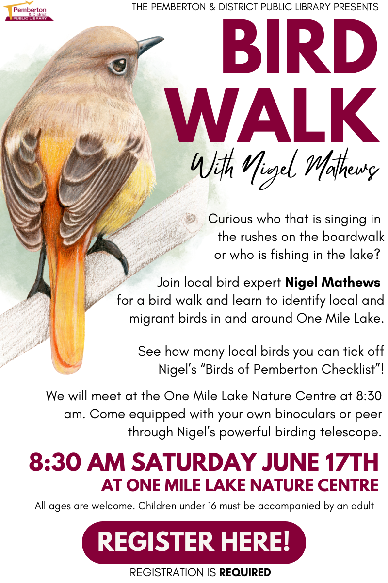Registration is required! Register here: https://pembertonlibrary.ca/…/bird-walk-with-nigel…/