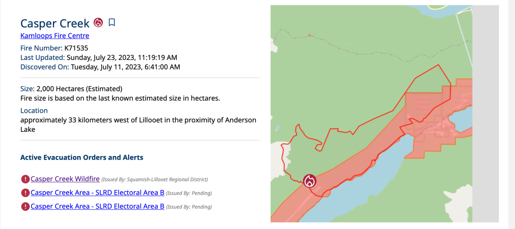 The Casper Creek wildfire is now over 2000 hectares in size, and has prompted an evacuation order for more than 200 properties, extending recently to include the entire area of Seton Portage and Tsal’alh.