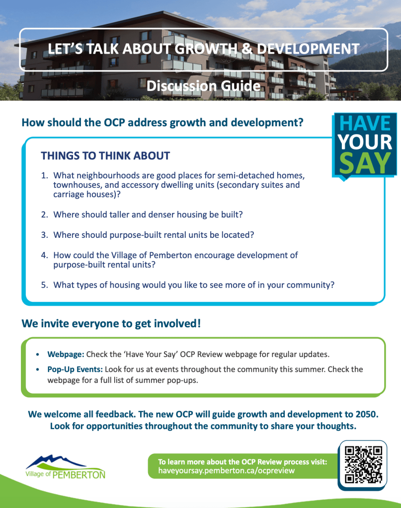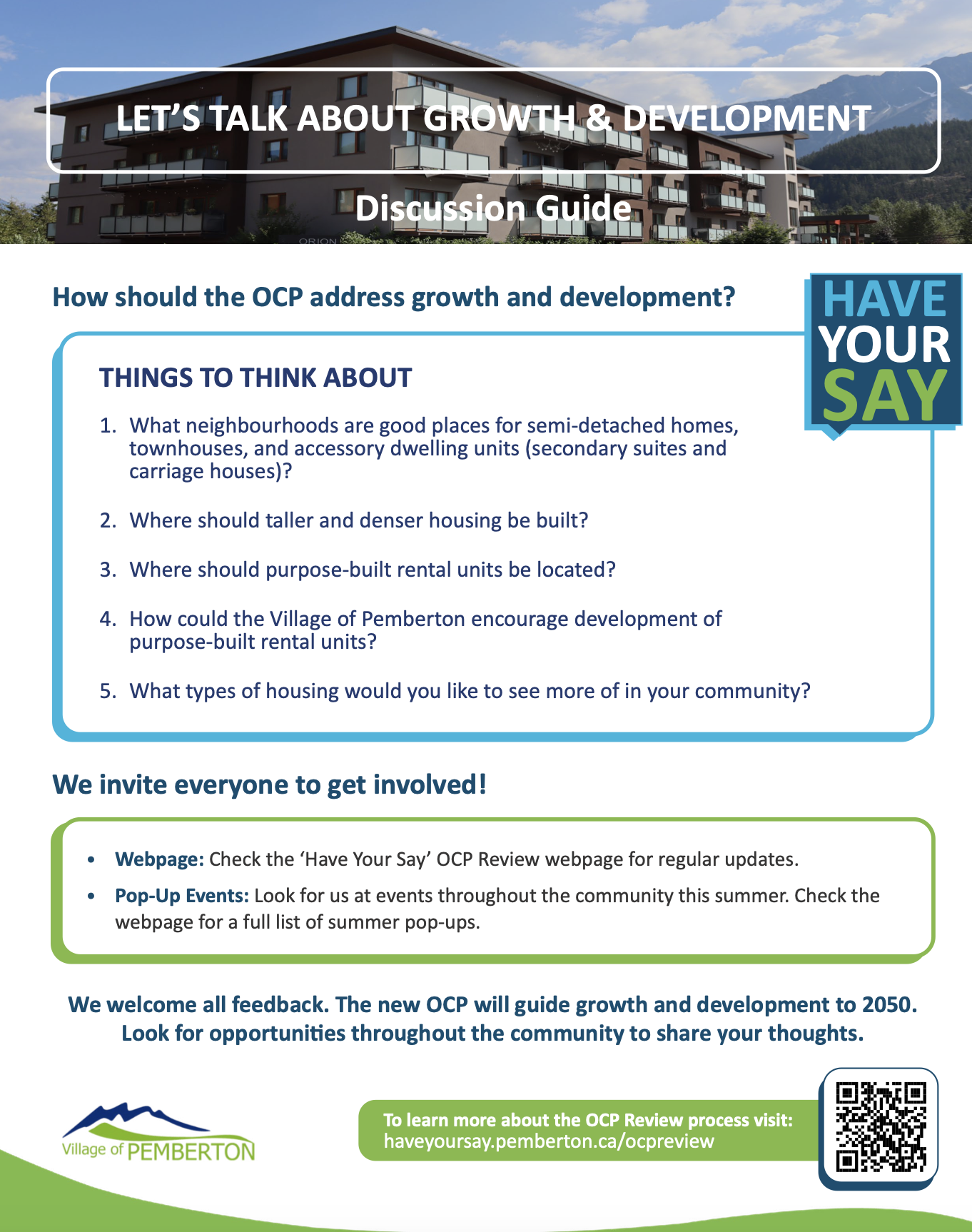 Next week, September 01 2023, the Village of Pemberton will host a summer pop up from 3pm – 6pm, to check out the Official Community Plan efforts and add your comments to the direction this town is headed.