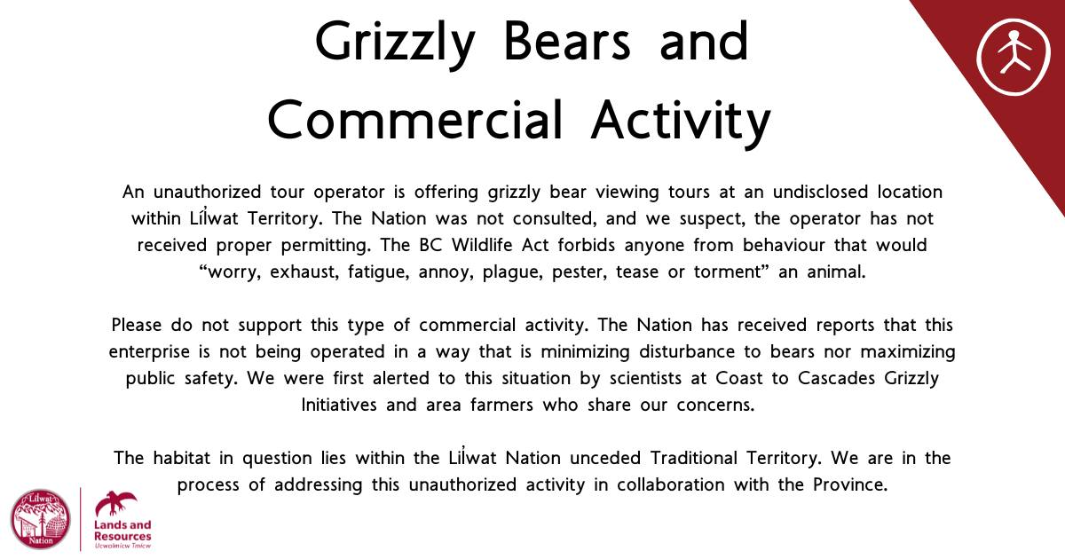 A notice regarding the recent developments of commercial activity surrounding Grizzly Bears. We do not support this activity and are asking the public to do the same.