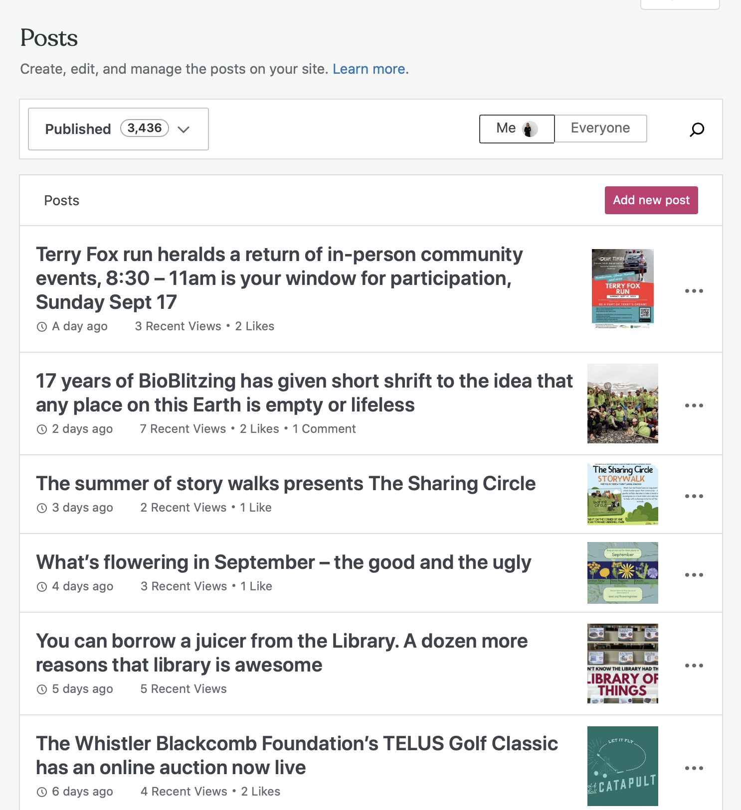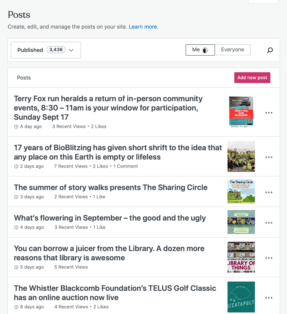 Yesterday, on the Wellness Almanac, I posted my 3436thth post. (Of a total of 4030 posts, thanks to a host of wonderful other contributors over the years.) I noticed this at the top of my screen, when I logged in to craft another dispatch, or ten, just after my old editor at Coast Mountain Life magazine shared a lament for the collapse of that ten year old publication during the earliest days of the pandemic.