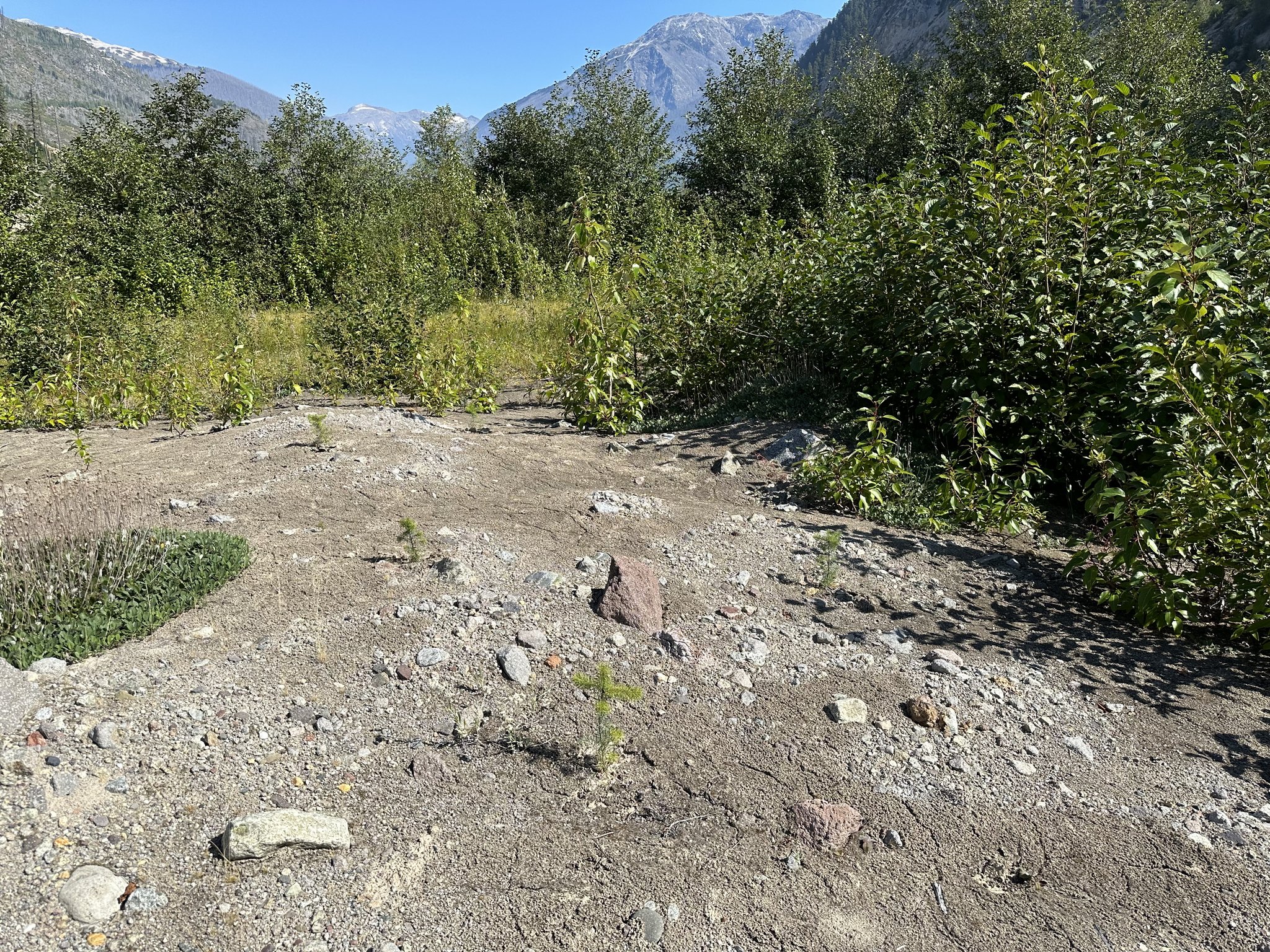 In early June 2023, we planted the first ~30,000 trees on the Capricorn Creek landslide site (the first site of many planned). We selected an area that had some natural recruitment, mostly alder, and some areas of standing water. As you recall, since May 2023, we have had very little rain, extremely low precipitation, and some very high temperatures.