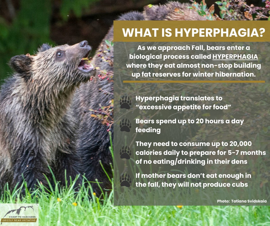 As Erica van Loon of the Coast to Cascades Grizzly Initaitive recently shared, “It’s that time of year when bears are entering Hyperphagia – a natural biological process of excessive eating to prepare for hibernation. It is critical to manage any possible attractants to keep them out of human food sources. There have been reports of bears getting into cars in Pemberton – they are in search of any form of food. Lock your cars, and do not leave any food remnants in there. Even a granola bar wrapper can be an attractant.”