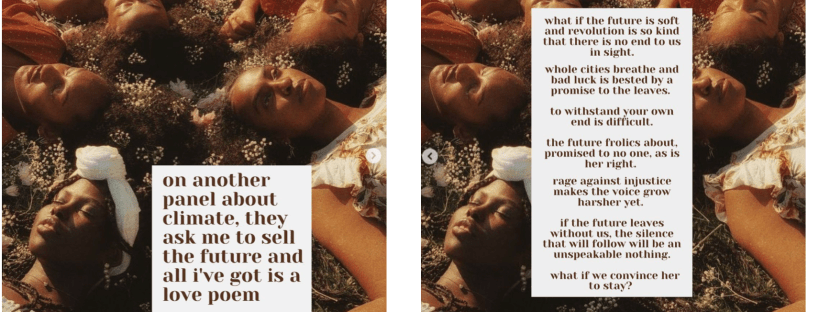 Siddiqa felt the effects of this lack of action viscerally last year as she witnessed from afar the life-altering impacts of Pakistan’s floods, likely made more extreme by global warming. She channeled those feelings into poetry as a form of protest. “It’s an effort to preserve what I have left, while I still have the time, in written form,” she says. “Art makes life worth living, and in my opinion, it’s what makes humans worth the fight. Like all of the things that we leave behind, all the creations, wouldn’t it be so unfortunate if there’s nobody on the other side to witness and observe them?”