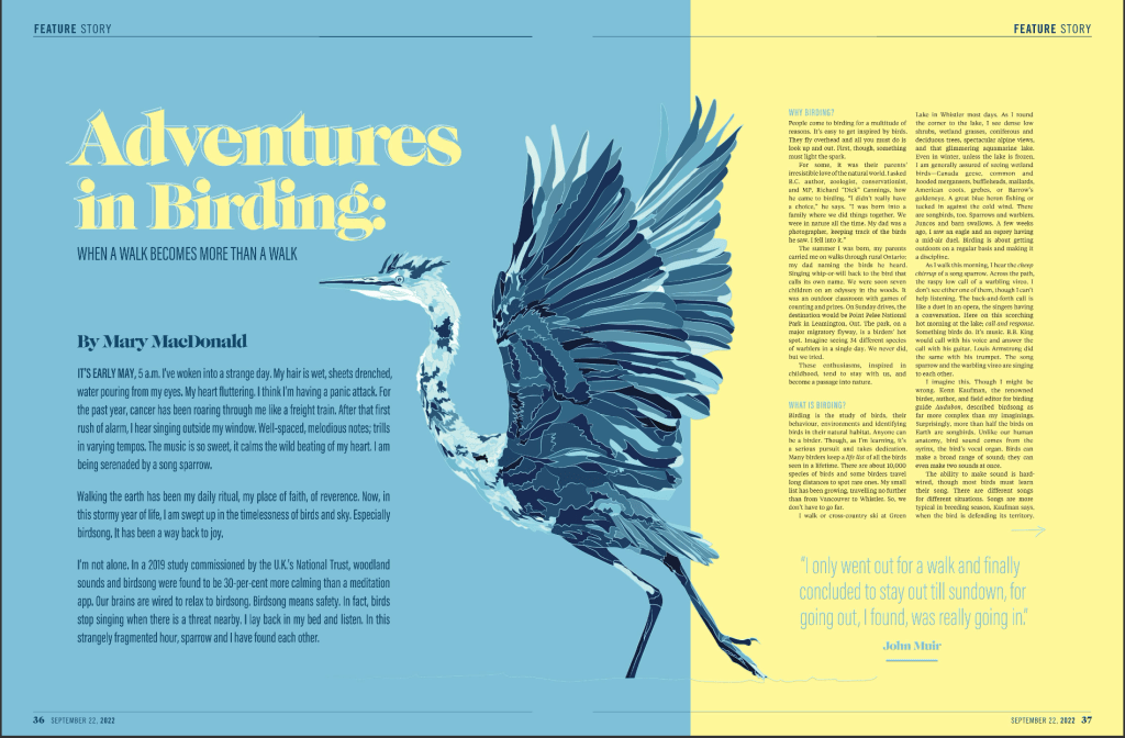My lovely friend Mary MacDonald dropped the seed for this idea, in my mind. She is a poet. Also a child psychologist. A dog-mama. A walker and a writer and an integral part of the Whistler Writing Society and Festival. A short story author. (See her collection The Crooked Thing at https://marymacdonald.ca.) A bird-watcher. Read her beautiful homage to bird-watching in the Pique, where she wrote this: