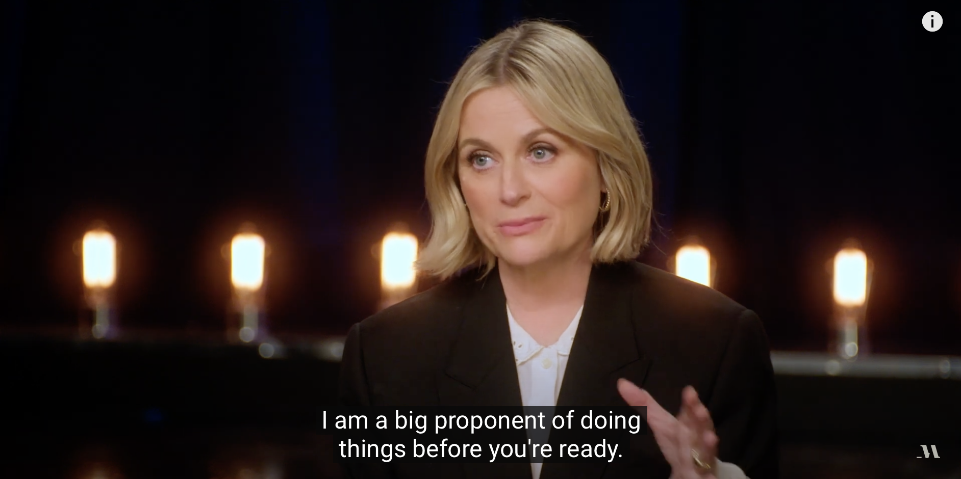 Twice in one day, I encountered the idea of “progress over perfection” and “perfect is the enemy of done”, from comedienne/writer/actor/directors – first, transcribing an interview I’d done with the wonderful Katie Burrell about her upcoming feature film Weak Layers (check it out at the Whistler Film Festival next weekend!) and about her career trajectory so far, and a few hours later, in a targeted ad from Masterclass with Amy Poehler, Amy said the same thing.