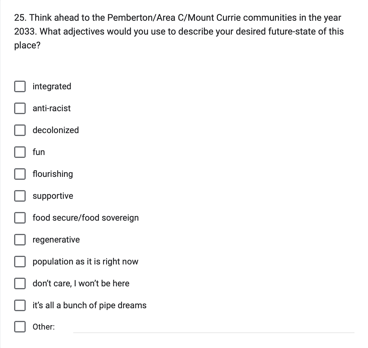 Sometimes it’s hard to come up with an entire vision, but you know it when you see it – is fun important? Is food security important? Is there something missing from the list entirely?