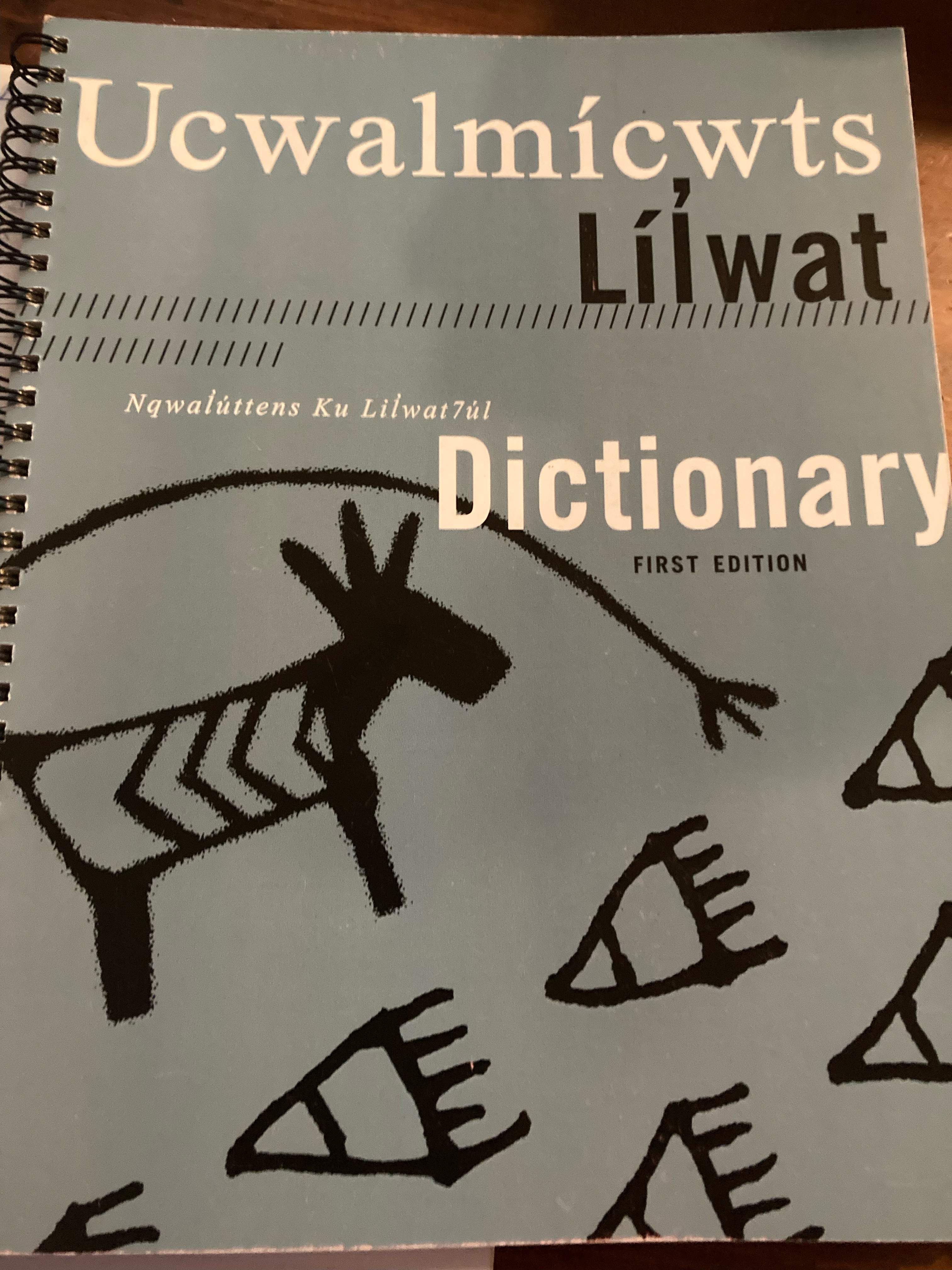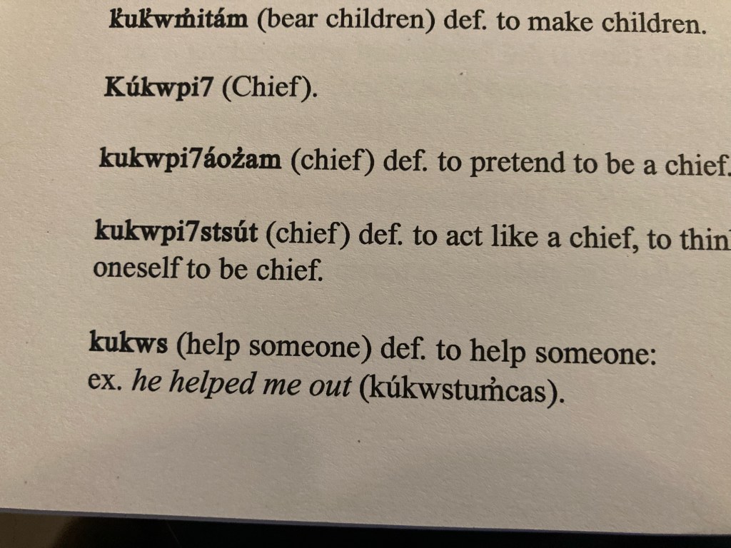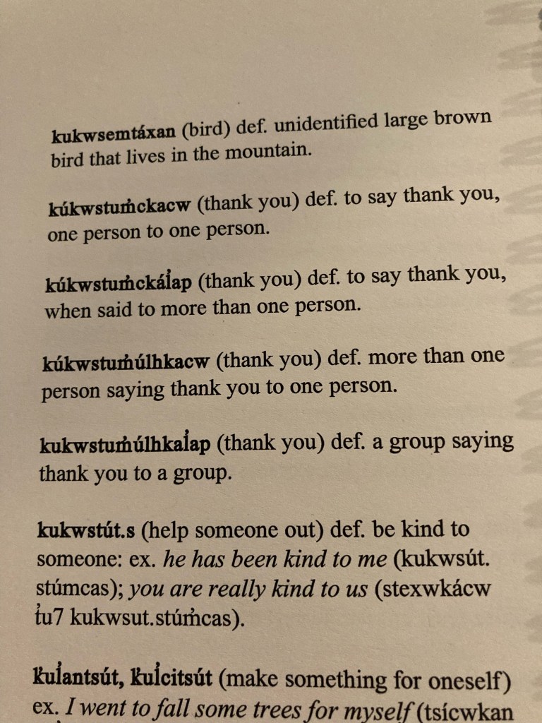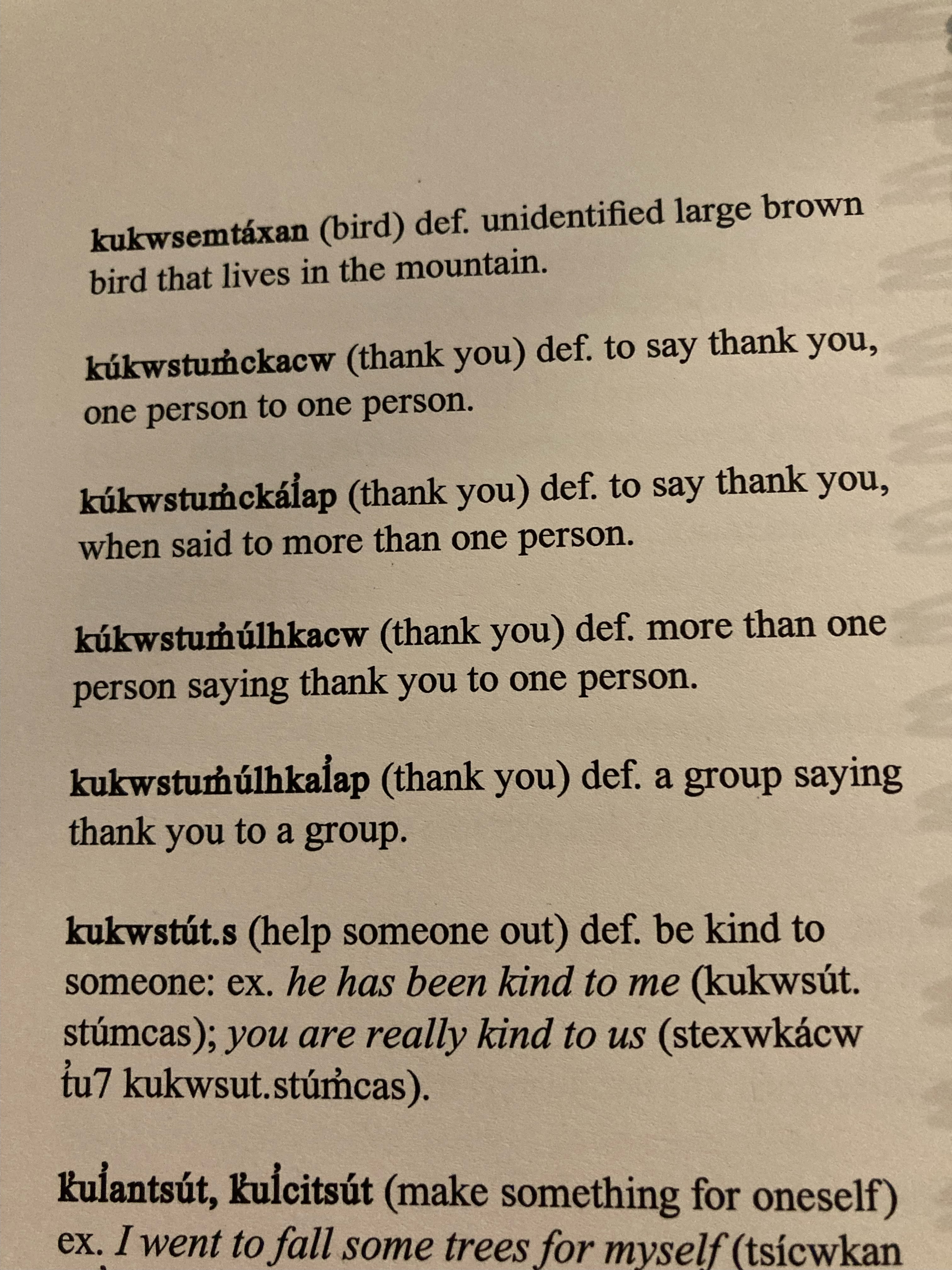 I pulled out my paper dictionary, and saw that “kúkwstum̓ckacw” starts with the word kukws, which means to help someone, and I thought: there is such wisdom embodied in this language. For giving thanks and helping someone to be interconnected in the very word, for the idea of helping someone out, being the equivalent of saving them, reminds us of our deep profound interconnectedness and interdependence.