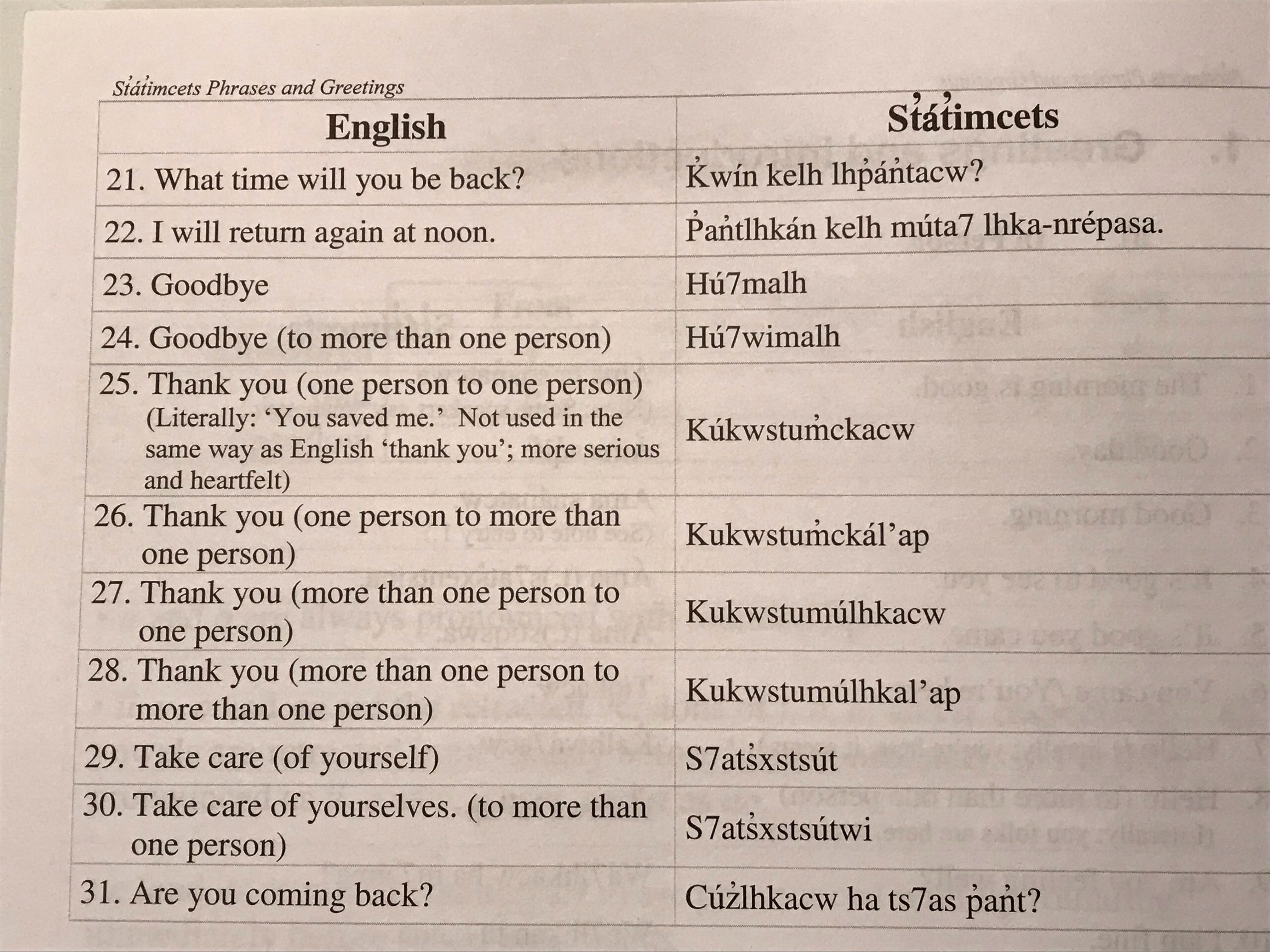 My friend Lisa sent me a note the other day. Often she will sign off with an Ucwalmícwts word or phrase, which makes me feel special, that she is sharing something so precious to her, with me. In this note, she shared that, in one of the paper language dictionaries (as distinct from the wonderful First Voices site), it says that the literal translation of “kúkwstum̓ckacw”, the word for “thank you”, is “you saved me.”