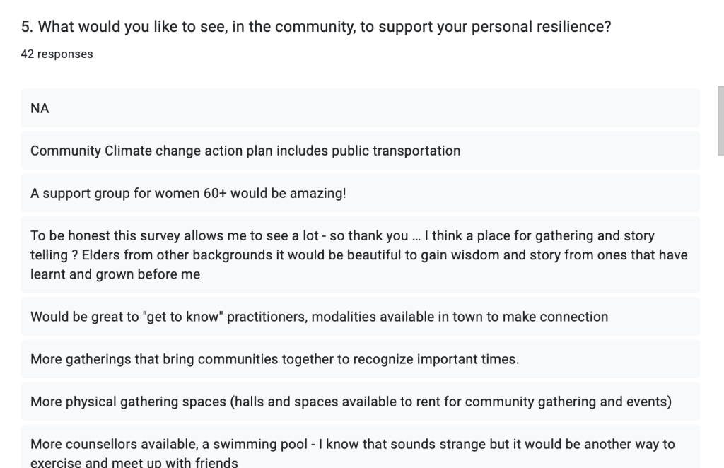 Community gathering spaces and events (including a pool), opportunities to connect, and more counsellors were the most common responses, when people were asked what they would like to see in the community to support personal resilience.