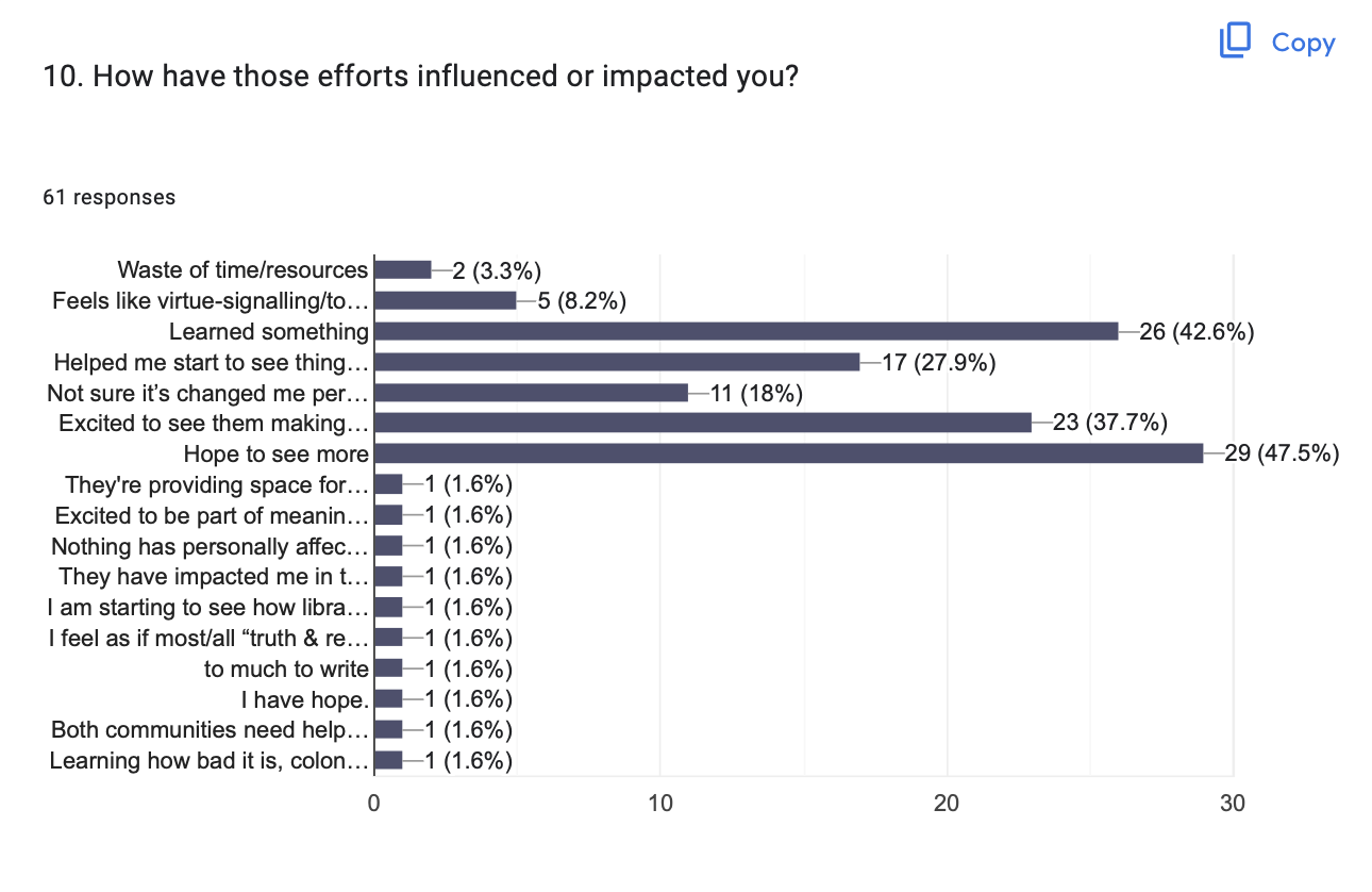 When I read the survey responses, I expected, honestly, to hear more people say “it’s a waste of time”, or “virtue-signalling/tokenism”, because that’s what my reading of the mainstream media, the toxic comments section of bullshit publications like the Vancouver Sun, or the Pemberton Community Forum page, sometimes makes me think everyone thinks. But actually, for the most part, people were very hopeful, and receptive, to initiatives that help us learn, unlearn and engage more deeply with each other, with Canadian history, and with how we might need to shift things for the future… Even things that haven’t personally affected people, have their support.