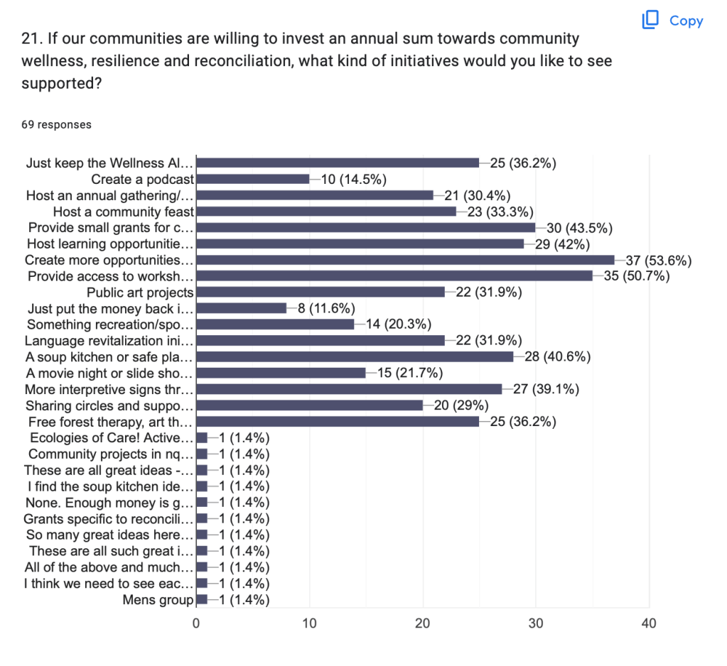 Each contributing party, the Village of Pemberton, Area C of the SLRD, and the Lil’wat Nation, contributed a modest amount, to power the Wellness Almanac. In the last three years, it was $6,000 each. We asked people, if there was to continue to be a small annual sum available for “community wellness, resilience and reconciliation”, what kind of initiatives would you want to see?