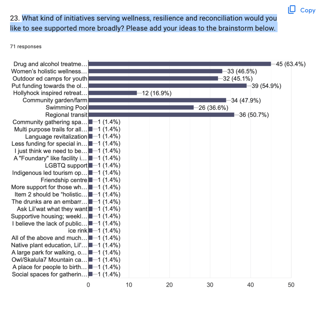 - 54.9% of respondents said “put funding towards the old Outdoor school and support Lil’wat men’s healing and other healing programs.”