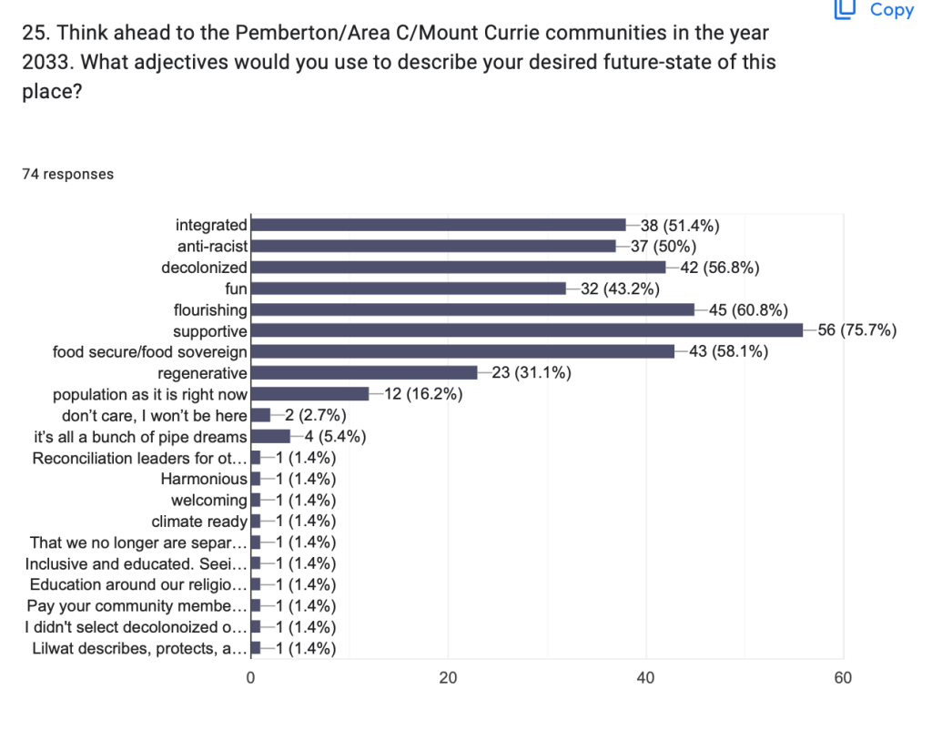Think ahead to the Pemberton/Area C/Mount Currie communities in the year 2033. What adjectives would you use to describe your desired future-state of this place?