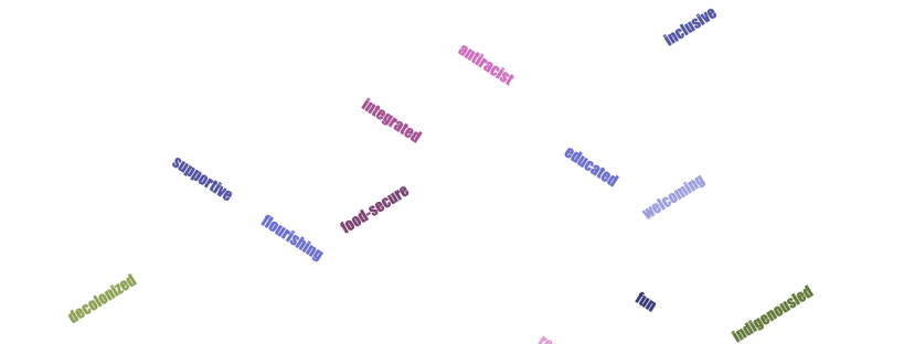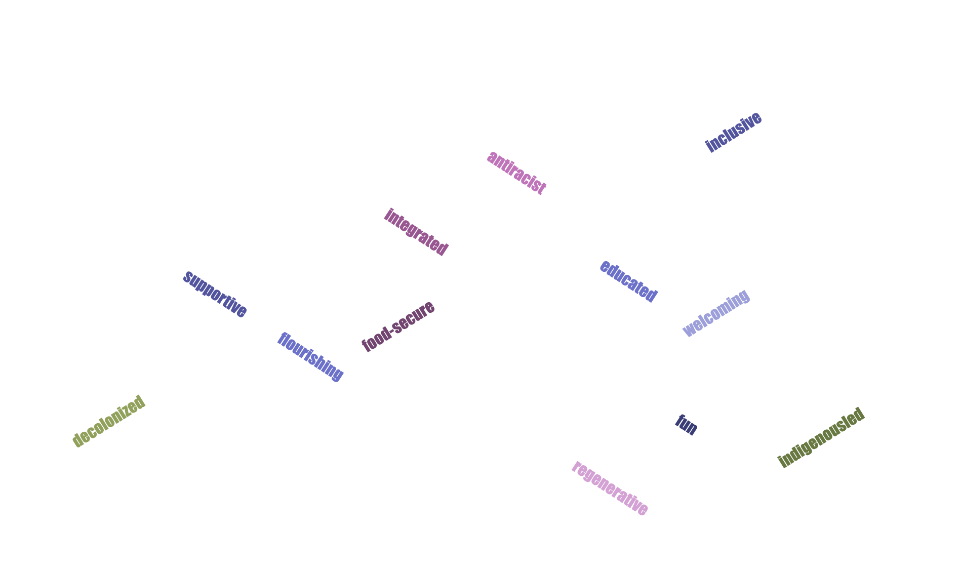 Only 6 of 74 responses indicated that people had given up or checked out – ie “I don’t care, I won’t be here, it’s all a bunch of pipe dreams.” Whereas over 3/4 of respondents held a vision of our communities as supportive. Followed by flourishing, food-secure, and decolonized.