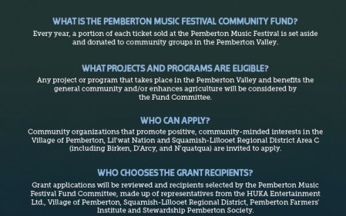 If you have a project or program that takes place in the Pemberton Valley and benefits the community or enhances agriculture, check out the information about the Pemberton Music Festival Community Fund, at the Village of Pemberton website. A portion of each ticket sold goes to the fund, to support community groups in the Village … Continue reading Apply for Pemby Fest funds
