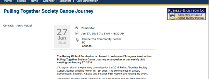 The Rotary Club of Pemberton is pleased to welcome d'Artagnan Newton from Pulling Together Society Canoe Journey as a speaker at our weekly club meeting on January 27, 2016. d'Artagnan sits on the planning committee for the 2016 Pulling Together Society Canoe Journey which is now in its 16th year. The communities of Lil’wat, Samahquam, … Continue reading Guest speaker at the January 27 Pemberton Rotary meeting: Pulling Together Society Canoe Journey committee member d’Artagnan Newton