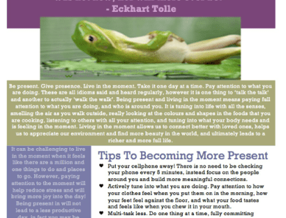 It can be challenging to live in the moment when it feels like there a million and one things to do and places to go. However, paying attention to the moment will help reduce stress and will bring more joy into the day! Being present will not lead to a less productive day. In fact, … Continue reading Live in the Moment: How to Be More Present
